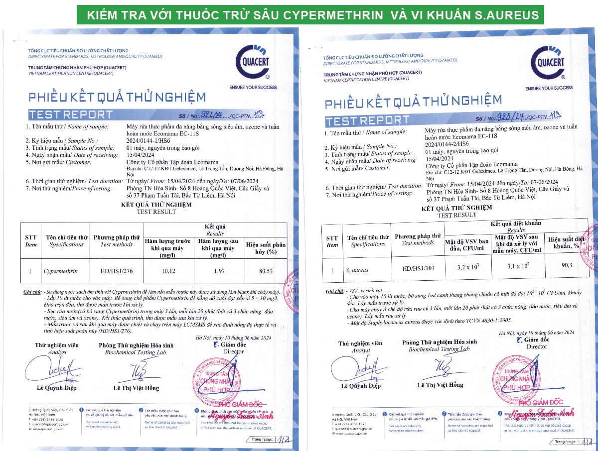 Sản phẩm được Ecomama sản xuất,công nghệ chuyển giao từ Đức có các kỹ sư từ Đức trực tiếp giám sát trong các giai đoạn sản xuất. Sản phẩm đã có giấy chứng nhận bộ Khoa Học Công Nghệ, Tổng cục đo lường chất lượng và nhiều giấy tờ kết quả thử nghiệm khác nhau.